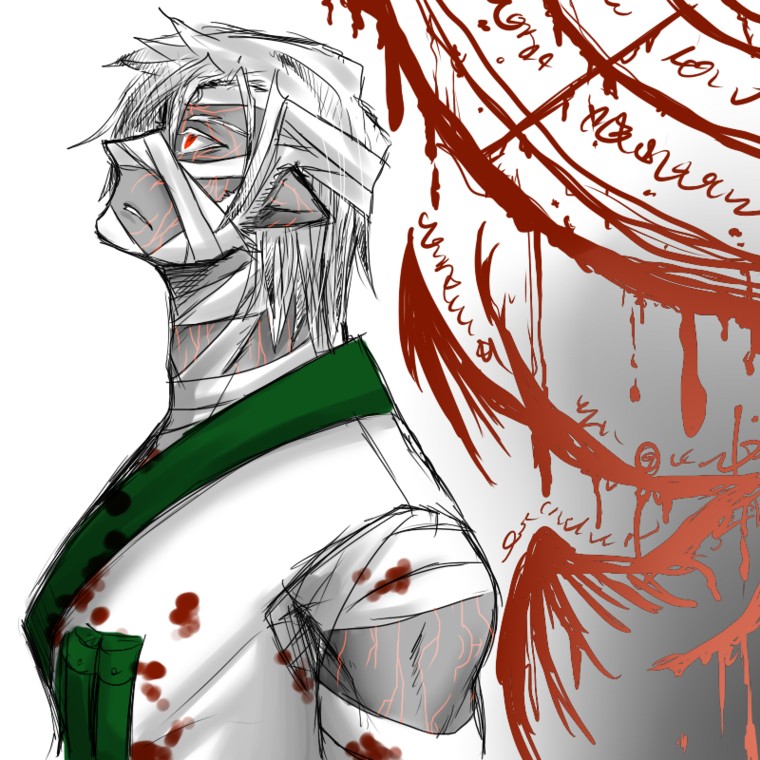 魔法陣っぽいのは勢いに任せて適当にそれっぽく見えれば良いなぁなんて(笑)あの某錬金術師のやつでよくある血で書きなぐりました的な。